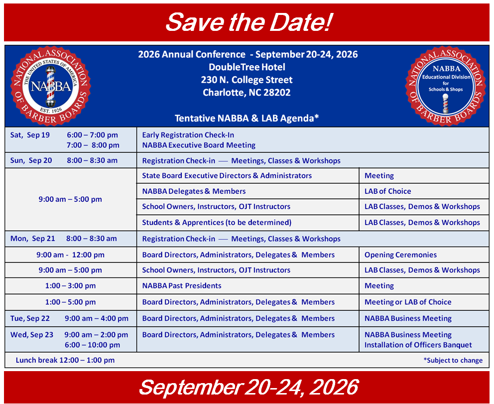 The National Association of Barber Boards of America (NABBA) was formed in 1926 for the purpose of maintaining professional standards and policies in the barbering industry. Membership in the NABBA is open to state barber boards and other entities responsible for licensure or other regulatory functions of the barbering profession.